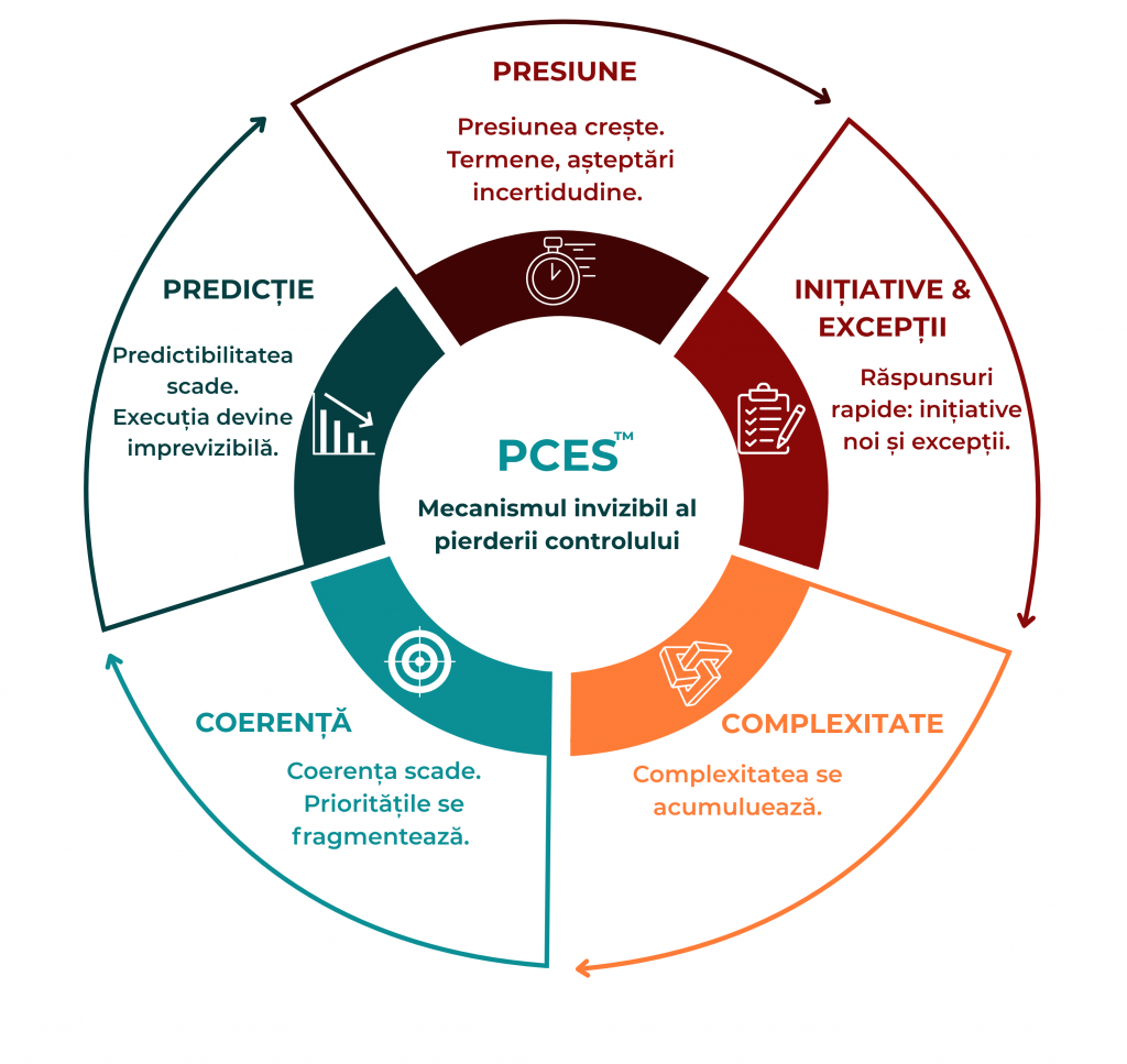 În multe organizații mature apare același tipar: Presiunea crește. Pentru a răspunde presiunii apar inițiative noi și excepții operaționale. Acestea cresc complexitatea organizațională. Complexitatea reduce coerența între strategie și execuție. Predictibilitatea scade. Presiunea crește din nou. Acest ciclu este recurent și auto-alimentat dacă nu este gestionat deliberat. Aceasta nu este o problemă de competență. Este o problemă de acumulare treptată a complexității.