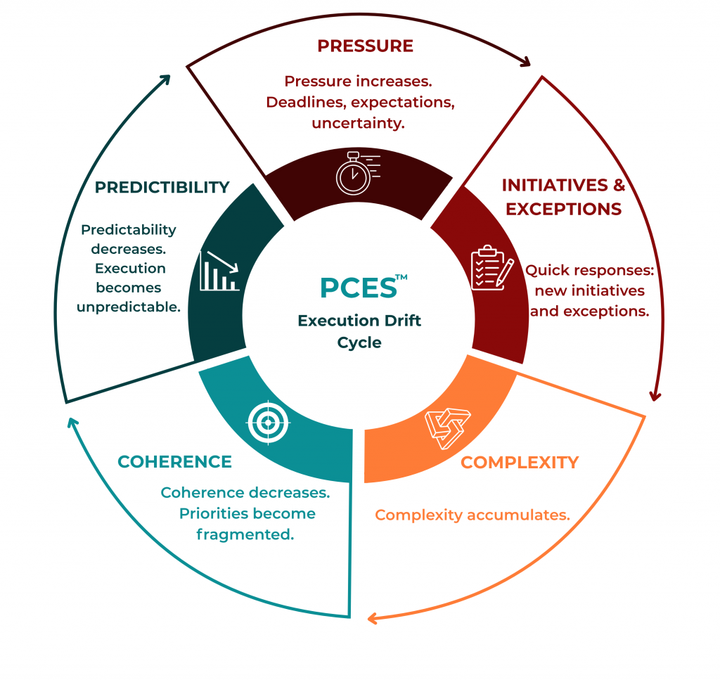 The PCES™ Model (Pressure, Coherence, Exceptions, Simplification) was developed as a way to understand this gradual execution drift and provide a structured way to analyze how organizations can regain control through deliberate simplification.